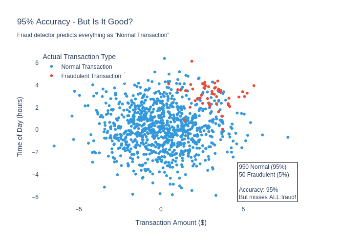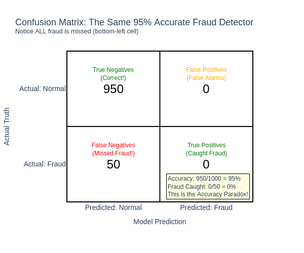 Now the failure is more clear – the model does not perform well on the most important part of the system - identifying fraud. It gets lots of True Negative cases, but zero True Positives! The model is 95% accurate but detects 0% of fraud. This is the second “Golden Rule” in action – measure what matters.