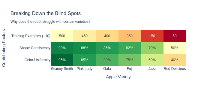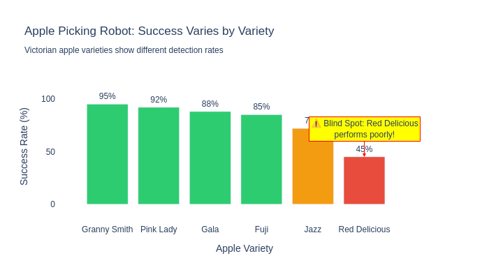 Diving deeper into the statistics can identify blind spots in your model. The AI model might perform well in some scenarios, but not as well in others. Fixing these can involve re-training the model with new data, adding a new specialist model (“if the fruit looks like an apple, use a different system”), or perhaps an entirely new technique is needed. In our fruit picking example, this could be as simple as identifying the success rate of the system per variety, shown in the following plot.